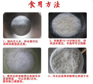 烹调性:煮熟后有韧性,不粘条、不糊汤,无重大晰条、无杂质的米粉为优质品;否则为劣质品。