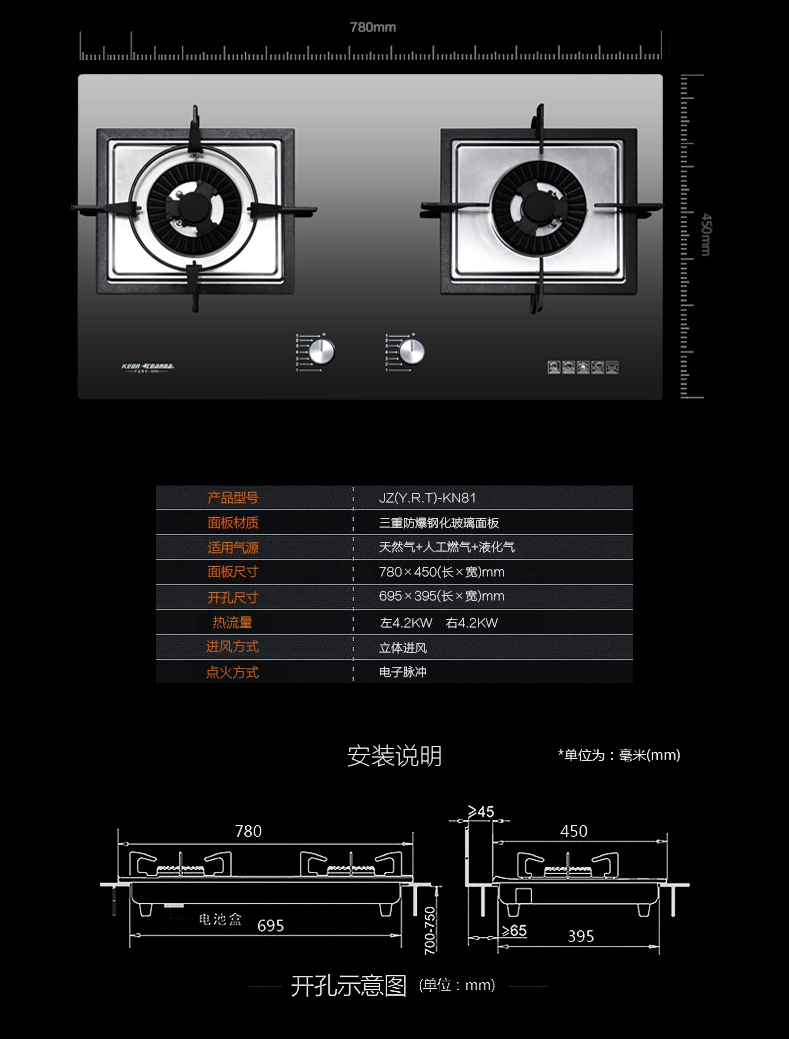 开孔尺寸:695×395(长×宽)mm
