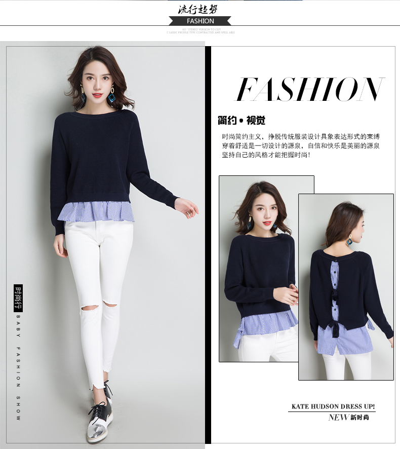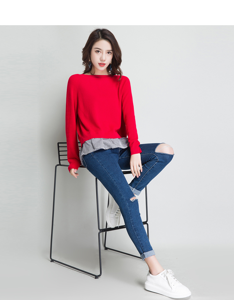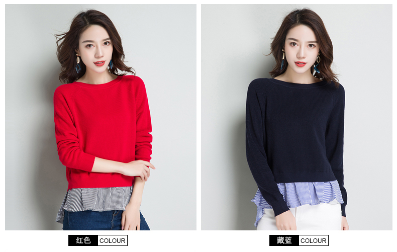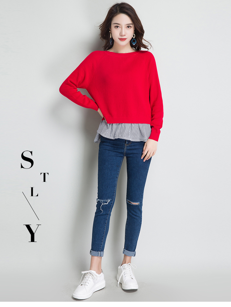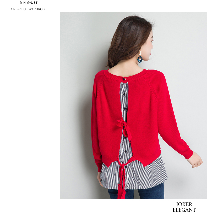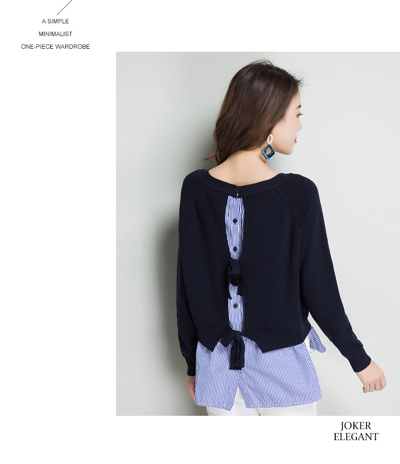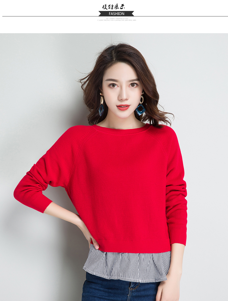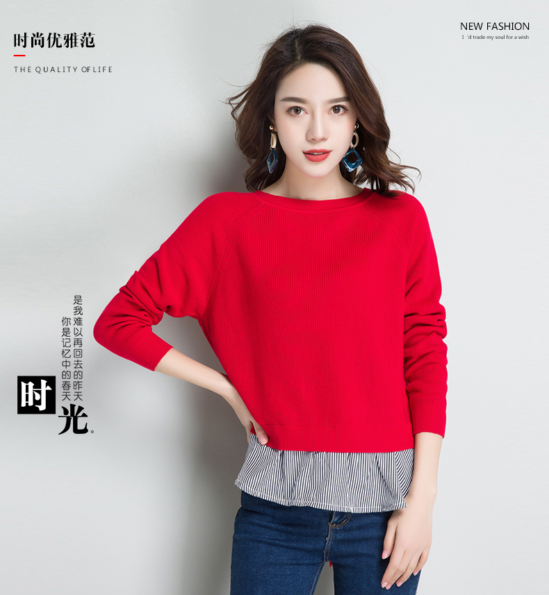 点击查看条纹假两件百搭长袖外穿针织衫女圆领宽松韩版2018春装新款t恤潮 CZ62