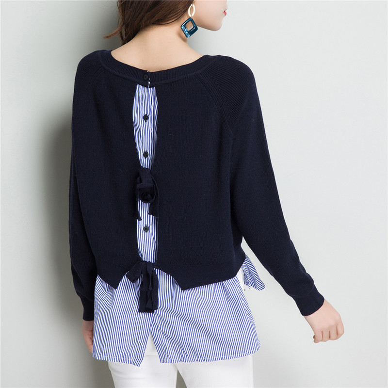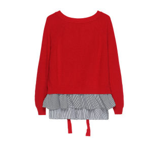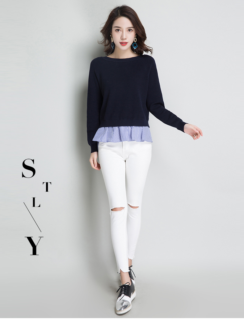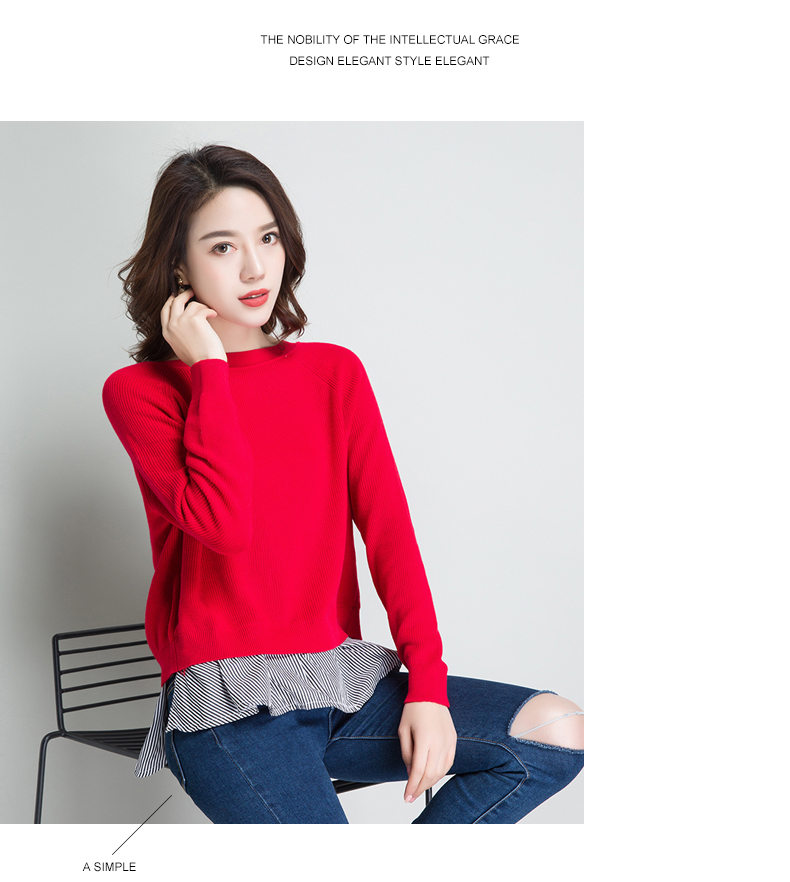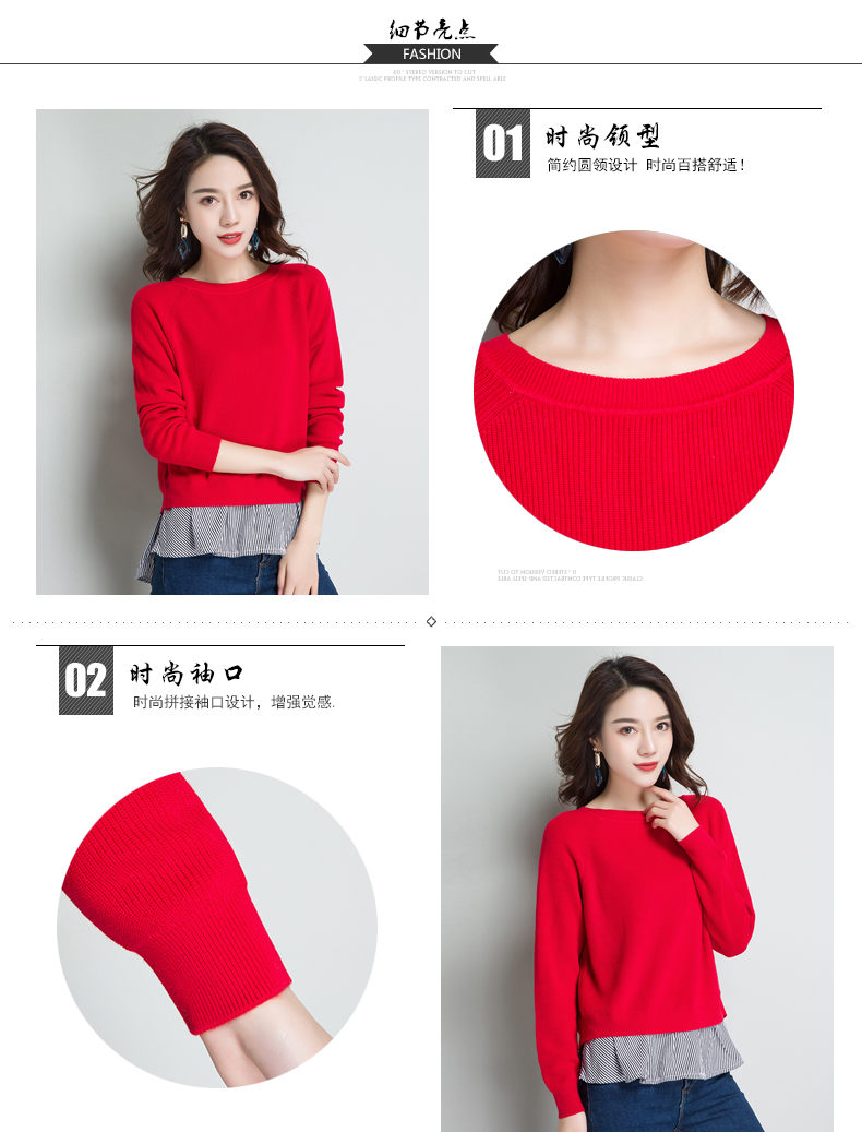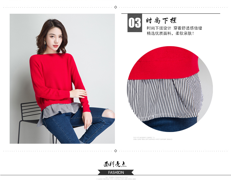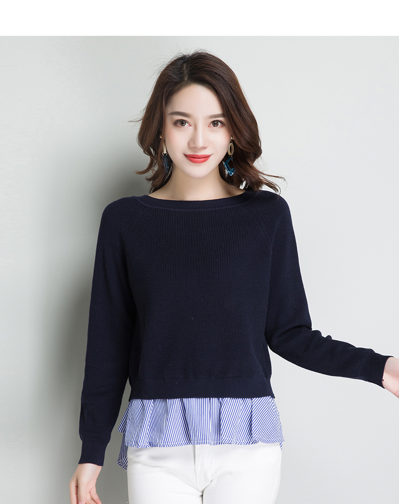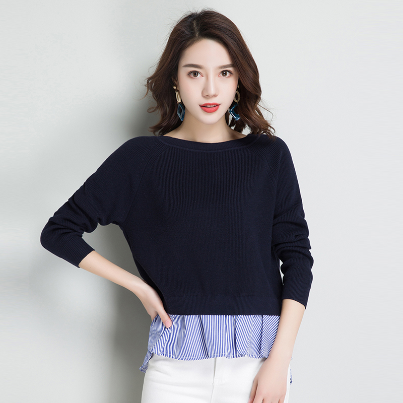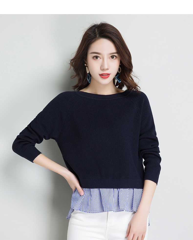点击查看条纹假两件百搭长袖外穿针织衫女圆领宽松韩版2018春装新款t恤潮 CZ62